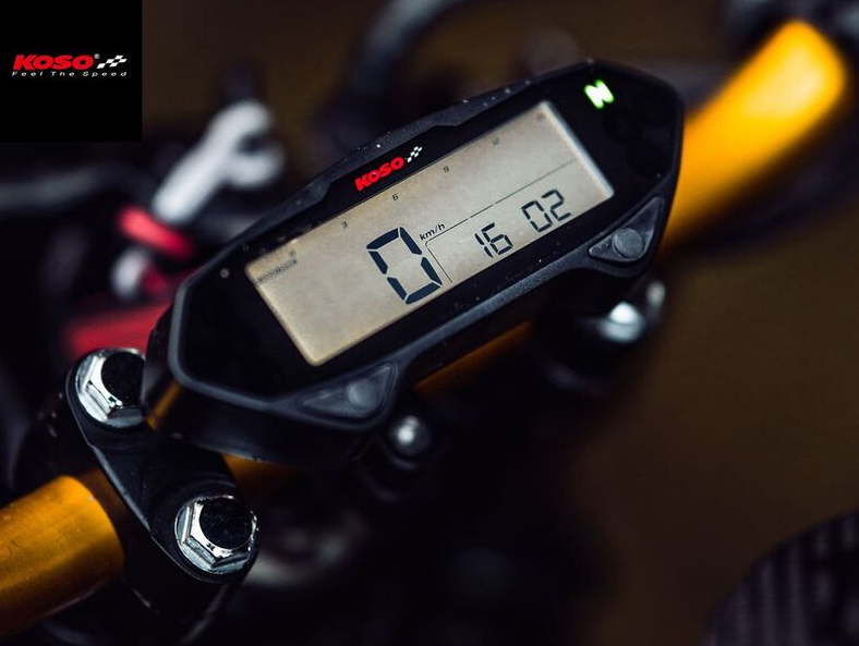 Le compteur Koso DB-01RN doté de l'affichage digital de la vitesse, d'un compte tour à barres d'une jauge à essence, de deux partiels (trip) et de nombreux voyants.