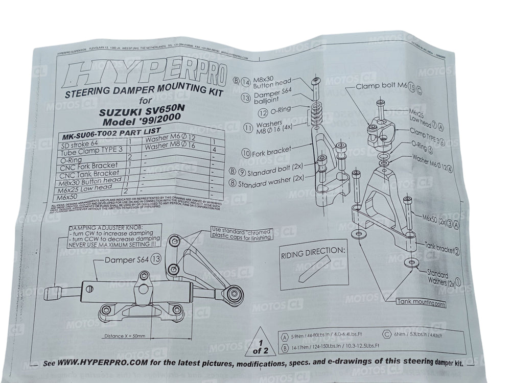 KIT FIXATION AMORTISSEUR DE DIRECTION TRANSVERSAL SUZUKI SV650N 1999 À 2002 HYPERPRO / RHHYMKSU06-T002