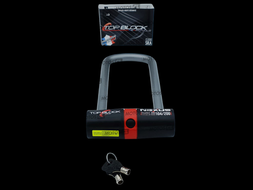 Protection contre le vol, antivol U universel, Honda, Kawasaki, Yamaha. Modèle NEXUS 104/200 certifié classe SRA, marque Top Block Fabriqué en France.