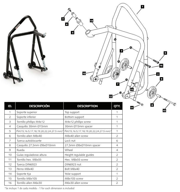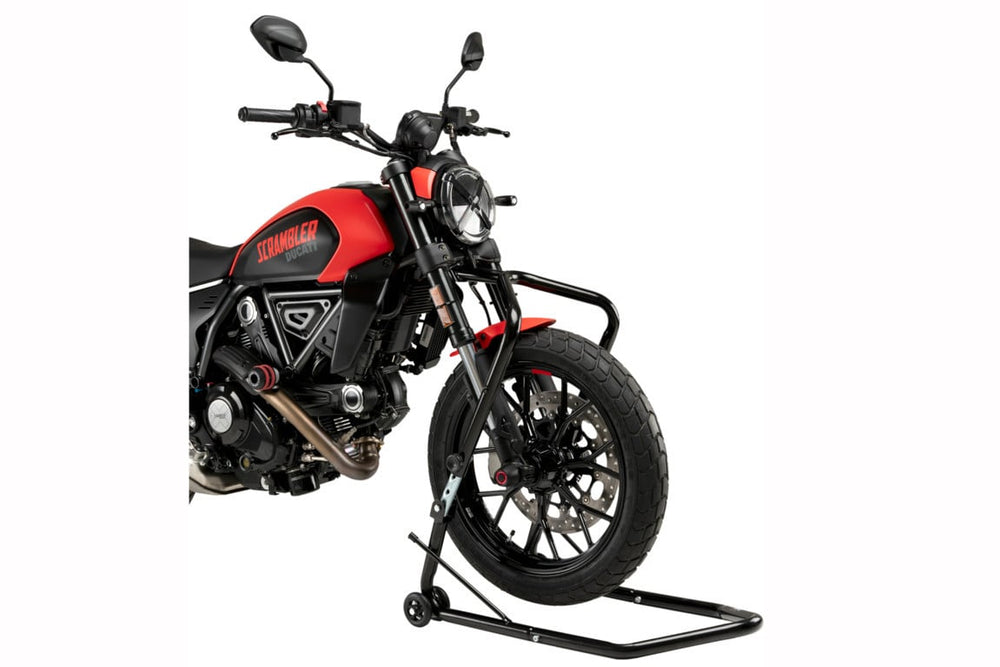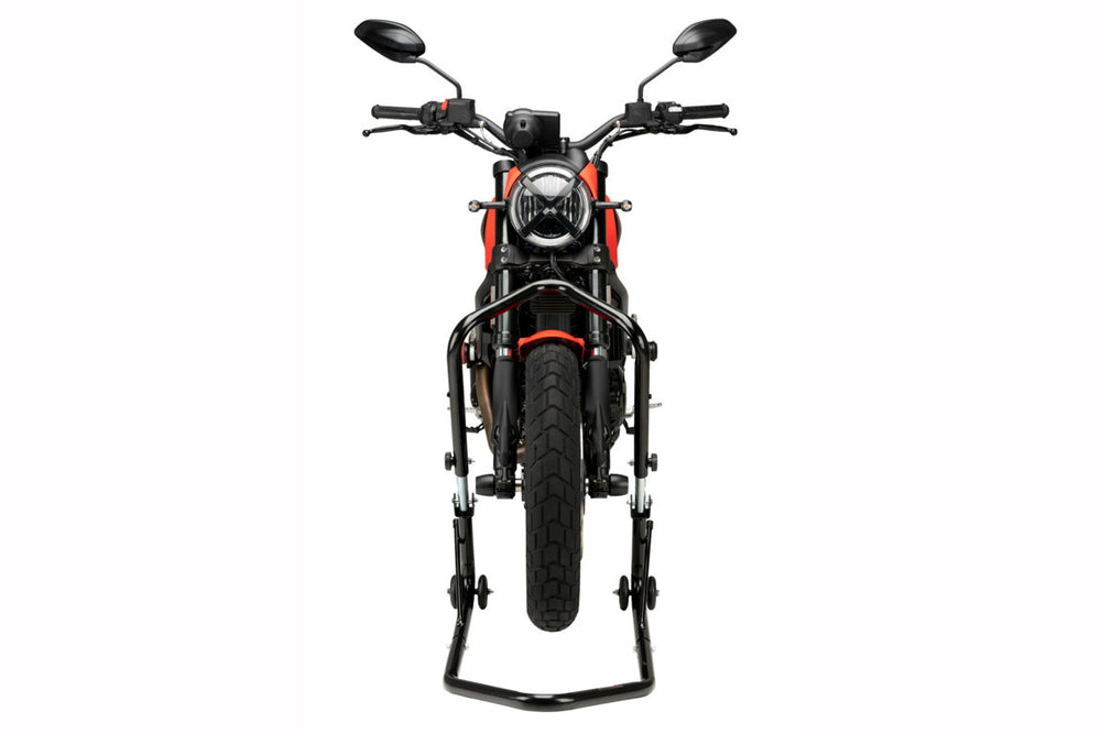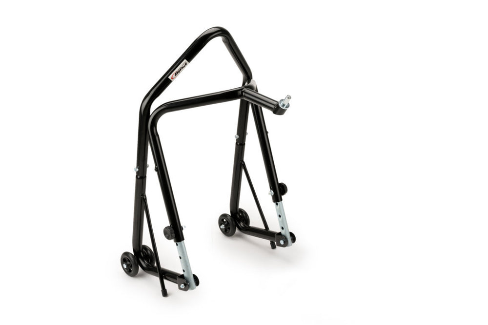 Permet de nettoyer, de démonter la roue avant ou la fourche complète de votre moto sans risque de la faire tomber. Peut servir également au stationnement.