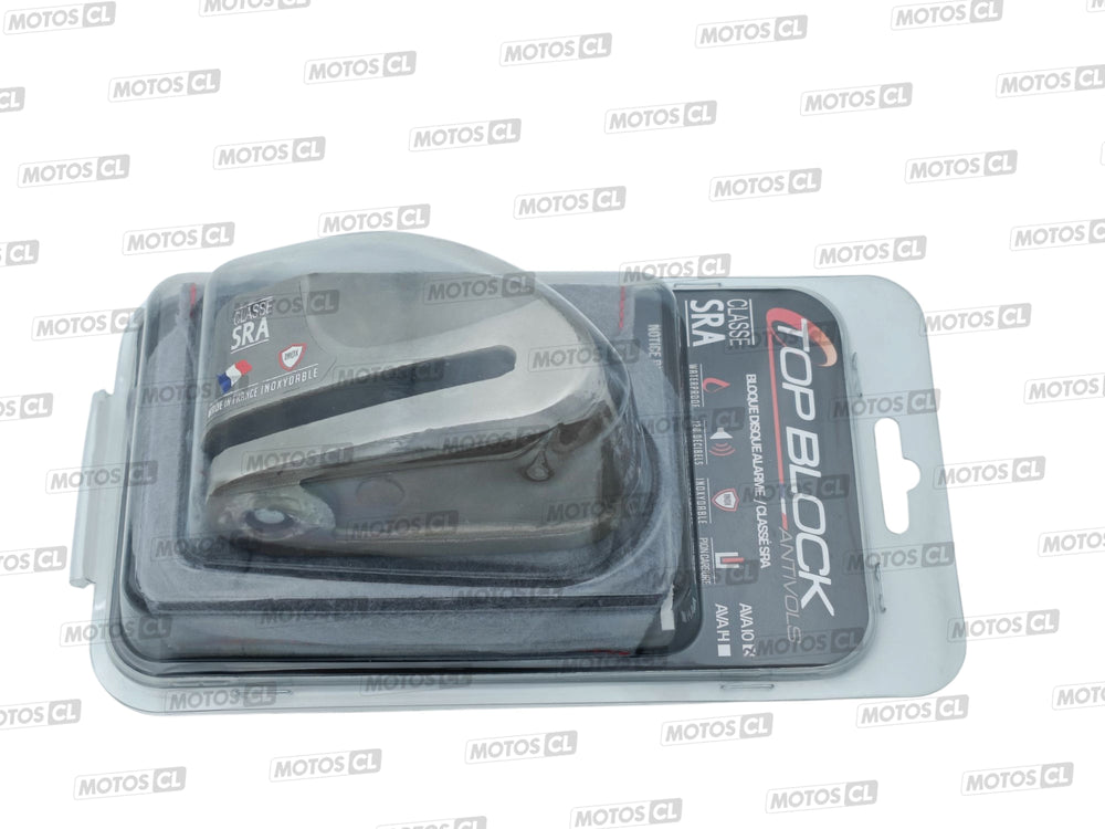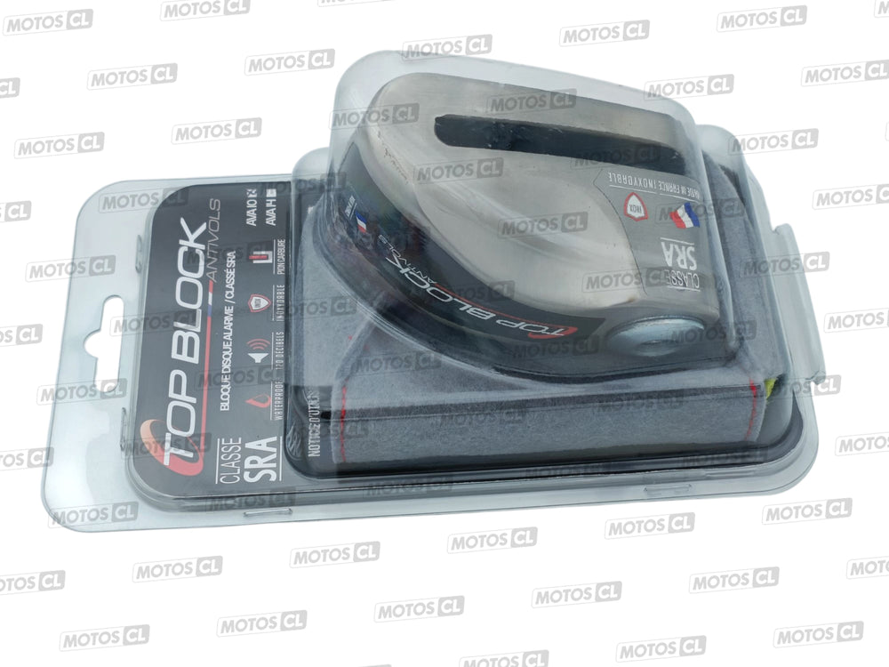 Protection contre le vol, antivol bloque disque alarme universel modèle AVA10 certifié classe SRA, axe Ø10mm* pour une résistance au sciage sans défauts, marque Top Block Fabriqué en France. Exemple : monte sur Honda Forza 125, Yamaha N-Max 125.