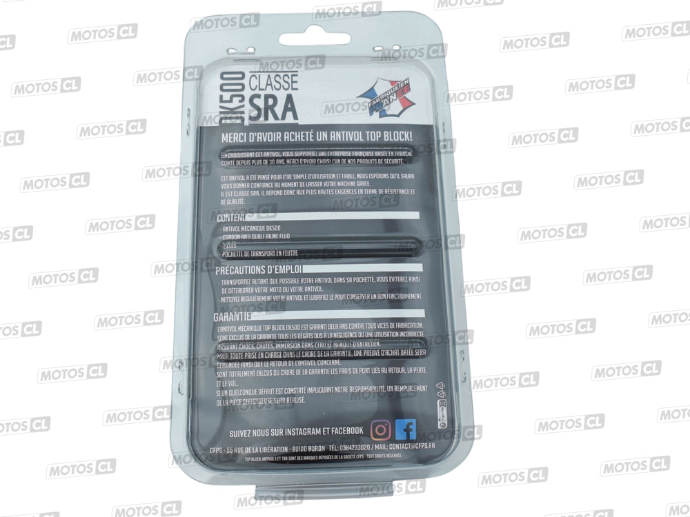 Protection contre le vol, antivol bloque disque universel modèle DK500 certifié classe SRA, axe Ø14mm* pour une résistance au sciage sans défauts, marque Top Block Fabriqué en France.