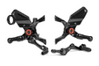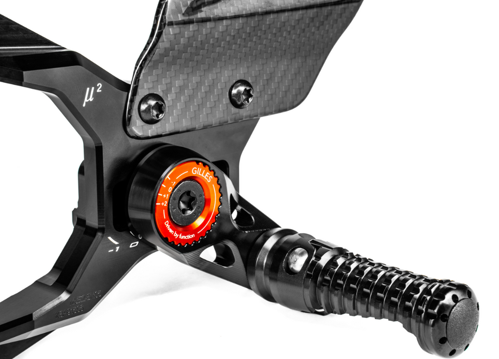 Commandes reculées MUE2* en aluminium usinées CNC de très haute qualité. Anodisé noir et ajusteurs rouge, réglable, homologué. Pour Bmw, M1000R, S1000R. Peut fonctionner en sélection de vitesse standard ou inversée (simplement en fonction du montage). Marque Gilles Tooling.