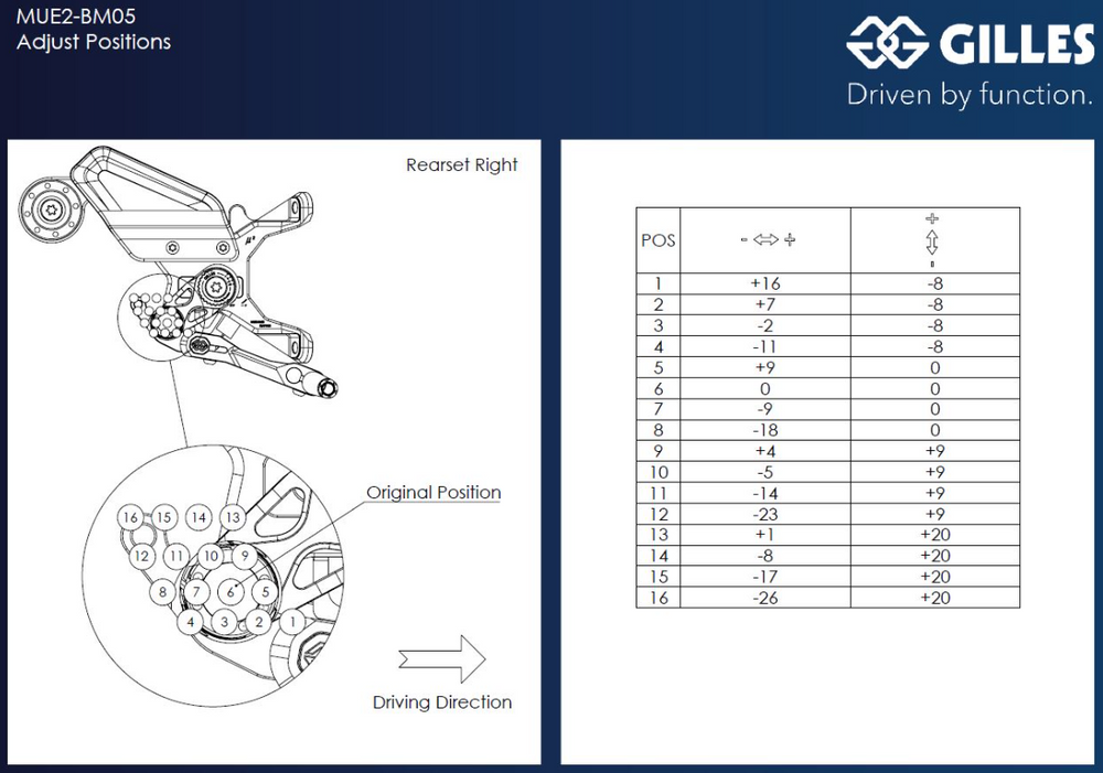 Le MUE2 dispose de repose-pieds articulés et réglables à volonté à l'aide d'excentriques, ajustable par une simple vis centrale offrant la possibilité d'aller vers le haut et vers l'arrière (voir tableau de réglages photo N°5). Sélecteur et pédale de frein montés avec double roulements à billes, réglables également en fonction des préférences de chacun (longueur du pied). Livré avec protèges talon en carbone.