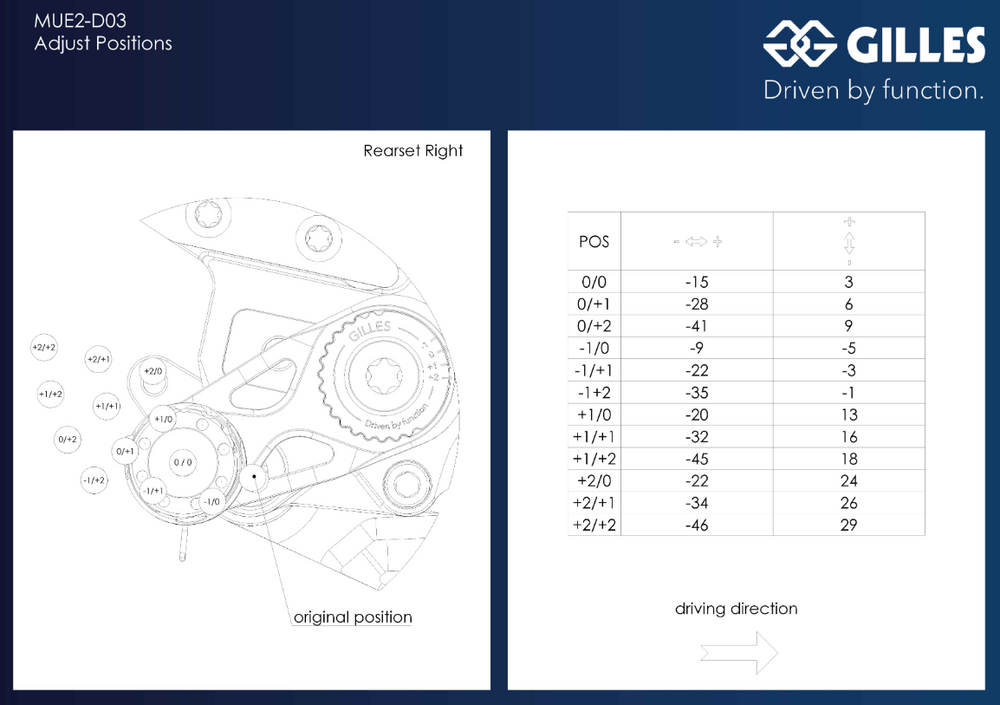Le MUE2 dispose de repose-pieds articulés et réglables à volonté à l'aide d'excentriques, ajustable par une simple vis centrale offrant la possibilité d'aller vers le haut et vers l'arrière (voir tableau de réglages photo N°3). Sélecteur et pédale de frein montés avec double roulements à billes, réglables également en fonction des préférences de chacun (longueur du pied). Livré avec protèges talon en alu.