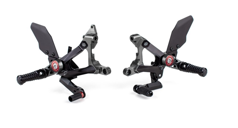 Commandes reculées MUE2* en aluminium usinées CNC de très haute qualité. Anodisé noir/titane et ajusteurs rouge, réglable, homologué. Pour Ducati, STREEFIGHTER V4, V4S. Peut fonctionner en sélection de vitesse standard ou inversée (simplement en fonction du montage). Marque Gilles Tooling.