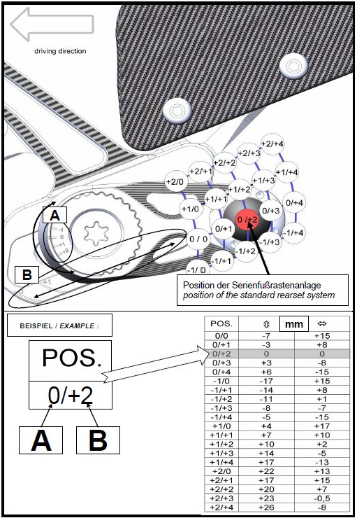 Le MUE2 dispose de repose-pieds articulés et réglables à volonté à l'aide d'excentriques, ajustable par une simple vis centrale offrant la possibilité d'aller vers le haut et vers l'arrière (voir tableau de réglages photo N°3). Sélecteur et pédale de frein montés avec double roulements à billes, réglables également en fonction des préférences de chacun (longueur du pied). Livré avec protèges talon en carbone.