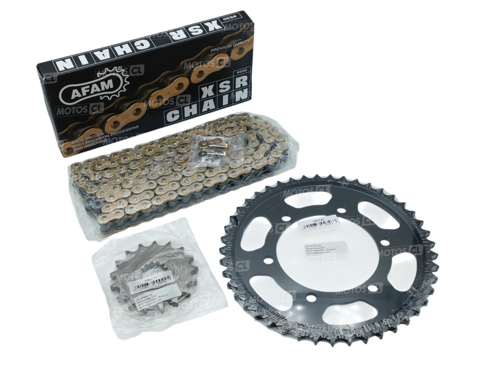 - Chaîne de transmission : AFAM 530XSR2G à joints toriques, super renforcée, 122 maillons, pas de chaine 530