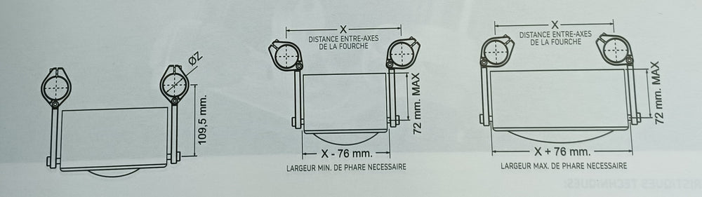 Installation facile grâce aux colliers qui s'ouvrent, aucun démontage nécessaire (ni té, ni tubes de fourche...). Réglages possibles avec les "pattes" supports qui sont articulés, permettant d'accueillir différents diamètres d'optique de phare, voir encombrement et dimensions photo N°3.