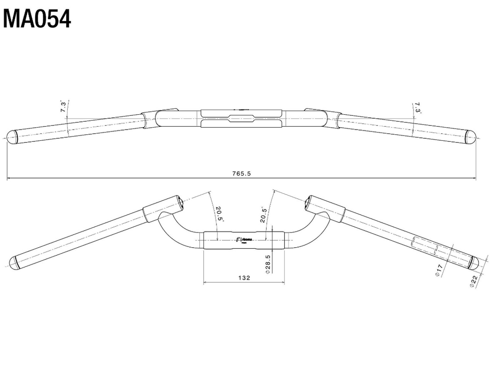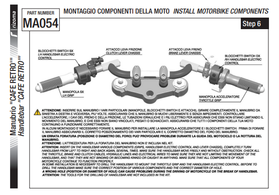 Guidon Rizoma Race Rétro Ø22-28,6mm, diamètre 28,6mm au niveau des pontets et 22mm au niveau des commodos, en aluminium anodisé noir.