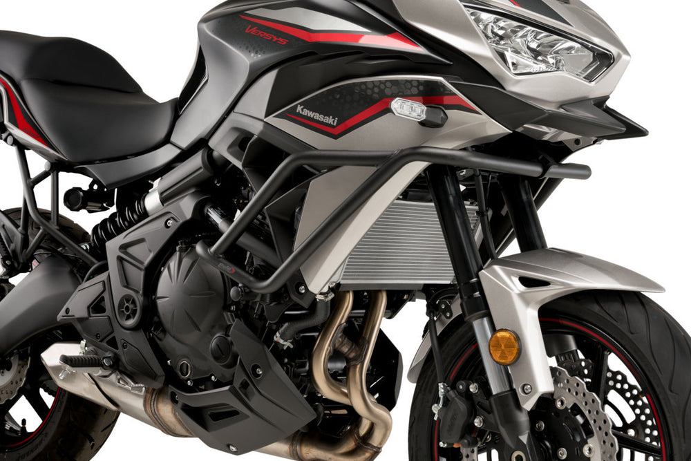 Pare-carters tubulaires Puig noir en acier Ø25mm, thermolaqué noir, pour Versys 650 Kawasaki compatible avec le sabot d'origine.
