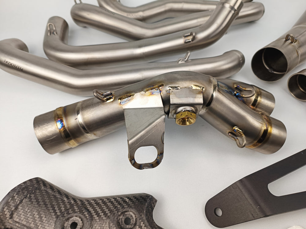 Ligne d'échappement prévue pour moto de compétition, équipée et réglée pour recevoir la ligne racing. Non homologué