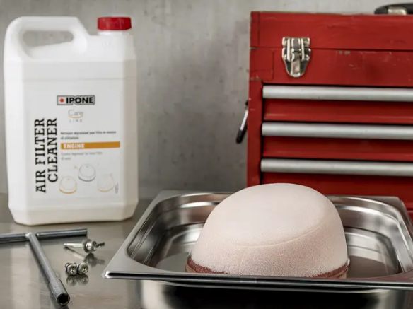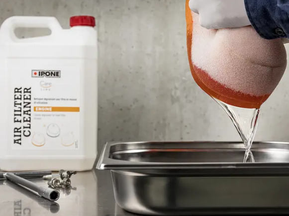 - Nettoyer le filtre à air avec Ipone Air Filter Cleaner en le baignant et en le pressant pour enlever toutes les impuretés, rincer et laisser sécher.
