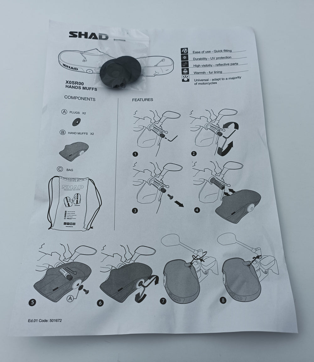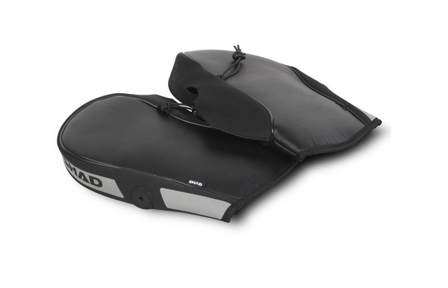 Manchons de protection contre le froid universels pour moto, scooter avec embouts de guidon, matière simili cuir et néoprène, imperméable, couleur noire avec éléments réfléchissants. Marque Shad.
