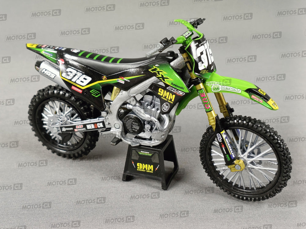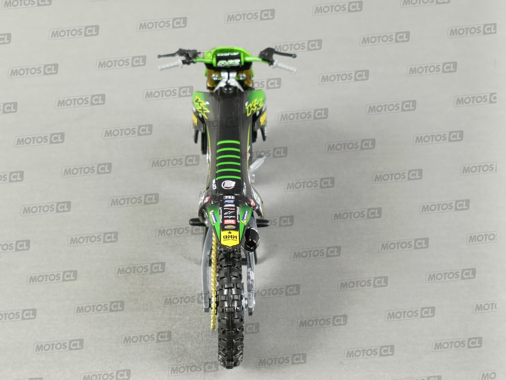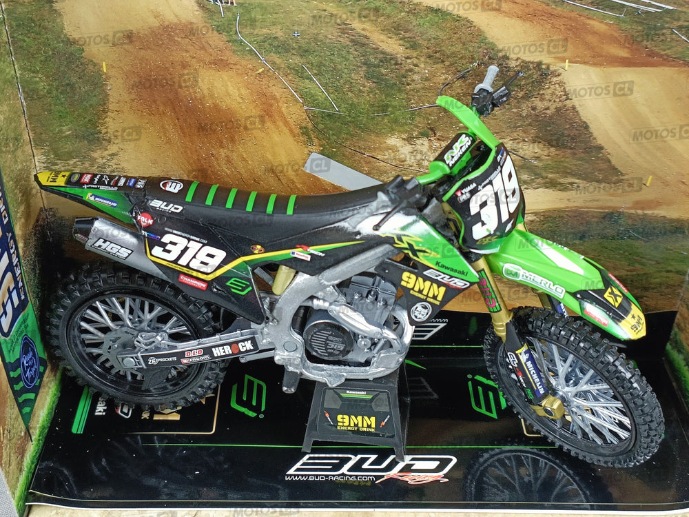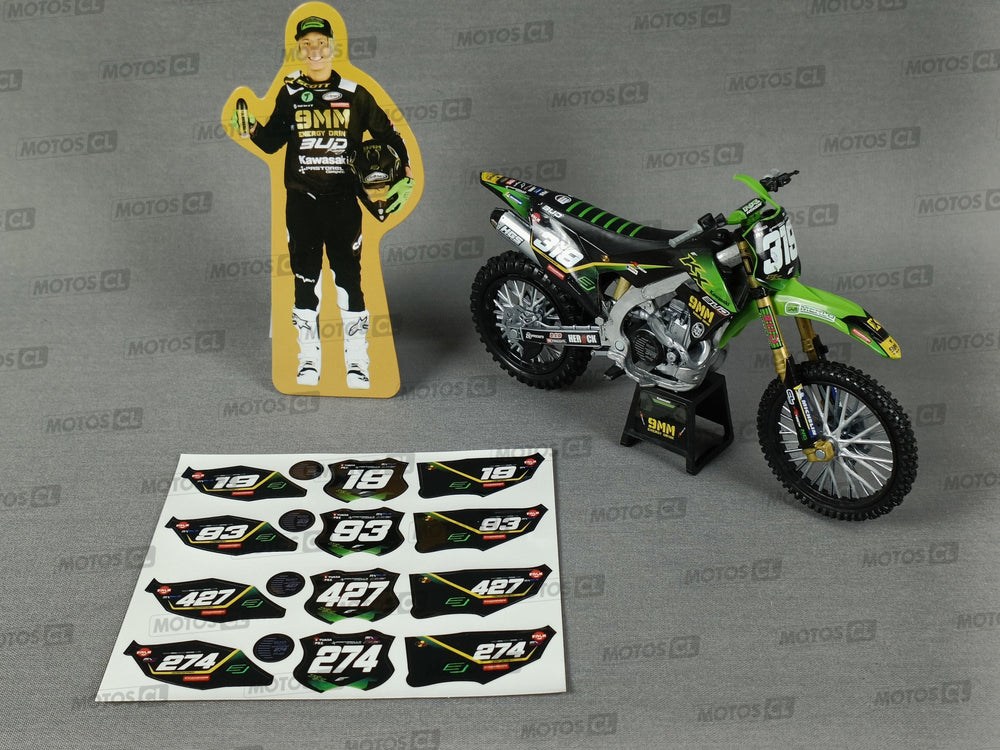 Miniature moto (échelle 1/12ème) Kawasaki KXF250 Bud Racing N°319 Quentin Marc PRUNIÈRE (stickers N°19 sacha COHEN, N°93 lucas COHEN, N°427 hakon FREDRIKSEN, N°274 amandine VERSTAPPEN inclus), marque New ray.