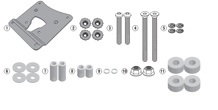 Livré avec fixations et notice de montage. S'installe sur les points de fixation d'origine, prévoir de percer le cache arrière (un gabarit est fournit afin de pouvoir le faire facilement).