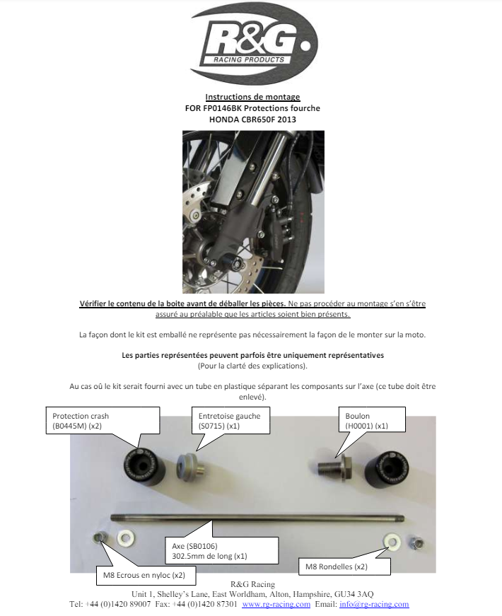 Protection pour bas de fourche et axe de roue avant pour Honda CB650F et CBR650F, marque R&G Racing.