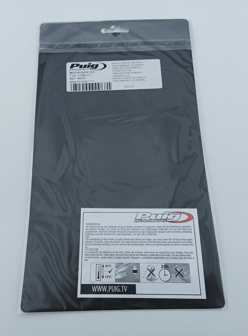Protège réservoir autocollant imitation carbone, marque PUIG.