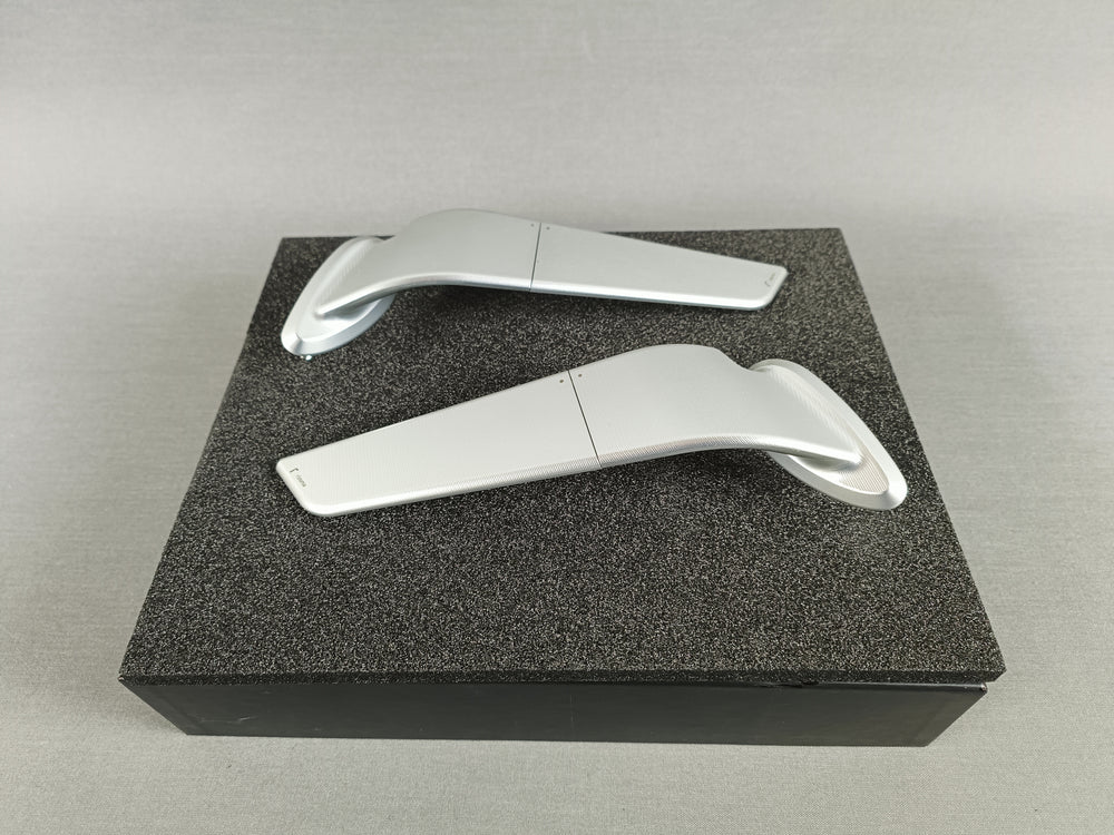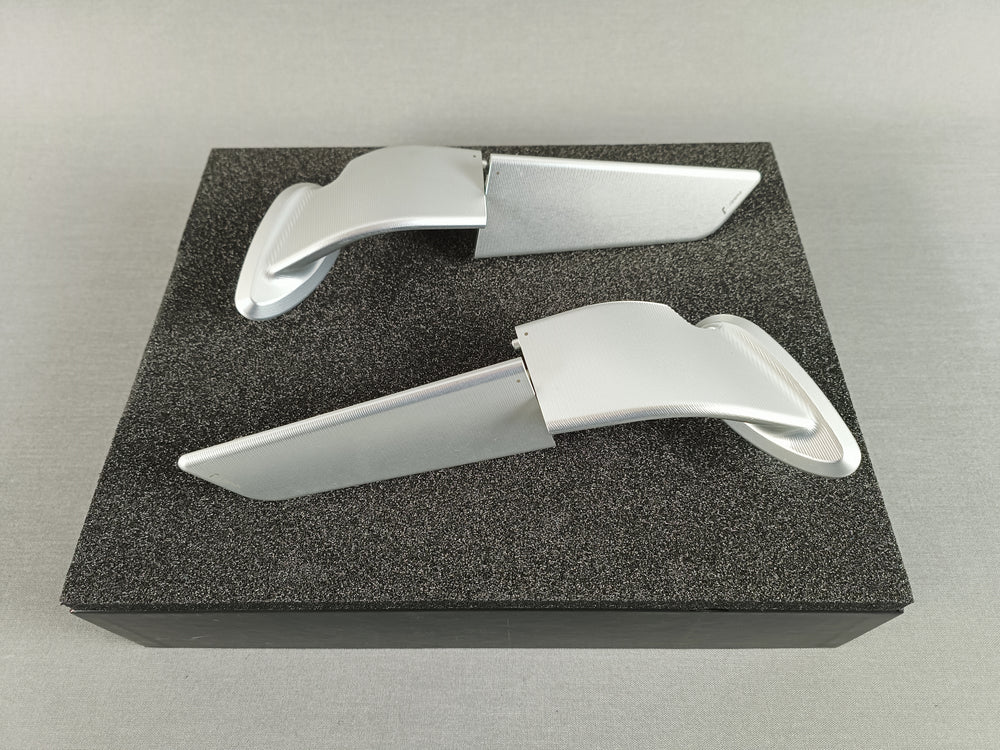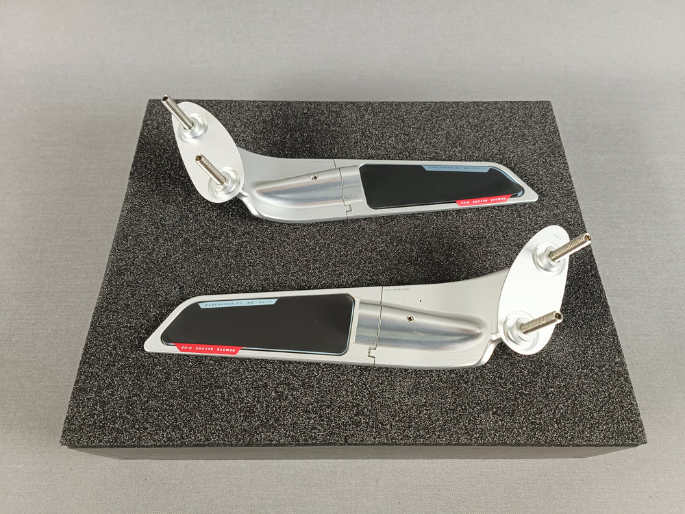 Les miroirs peuvent pivoter et permettent de transformer les rétroviseurs en ailerons aérodynamiques (prévoir l'installation des clignotants avant au niveau de la tête de fourche, supports et clignotants disponibles en option*).