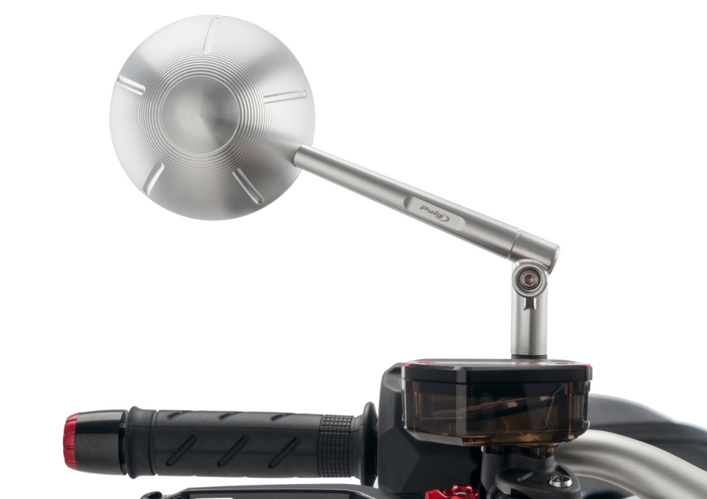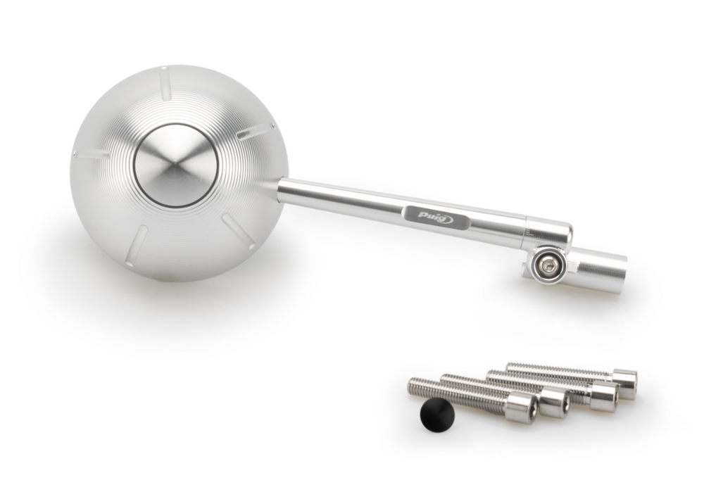 Rétroviseur universel Homologué PUIG en alu taillé dans la masse anodisé gris, modèle TOP-TECH I, montage sur le guidon côté droit.