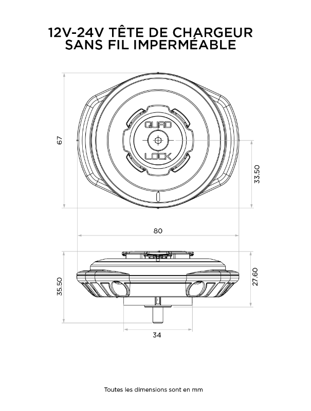 CHARGEUR DE TÉLÉPHONE INDUCTION MOTO ÉTANCHE QUAD LOCK® V2 12V-24V À BRANCHER ALIMENTATION + - / QLH-HW-WCH-2
