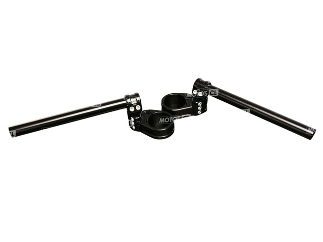 Demi guidons bracelets MULTICLIP Sport Slim ABM pour fourche Ø50mm, en aluminium haute résistance anodisé noir. Version spéciale slim pour les fourches à changement de diamètre. Réglables dans tous les sens. Existe en Ø52mm.