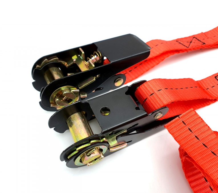 Sangles à cliquet avec crochets pour de transport de moto, scooter, quad, jet-ski, divers... Couleur noir-rouge. Marque Brazoline