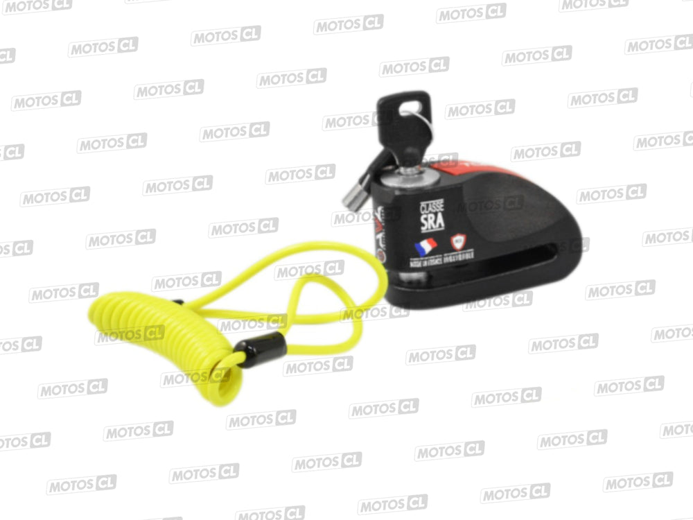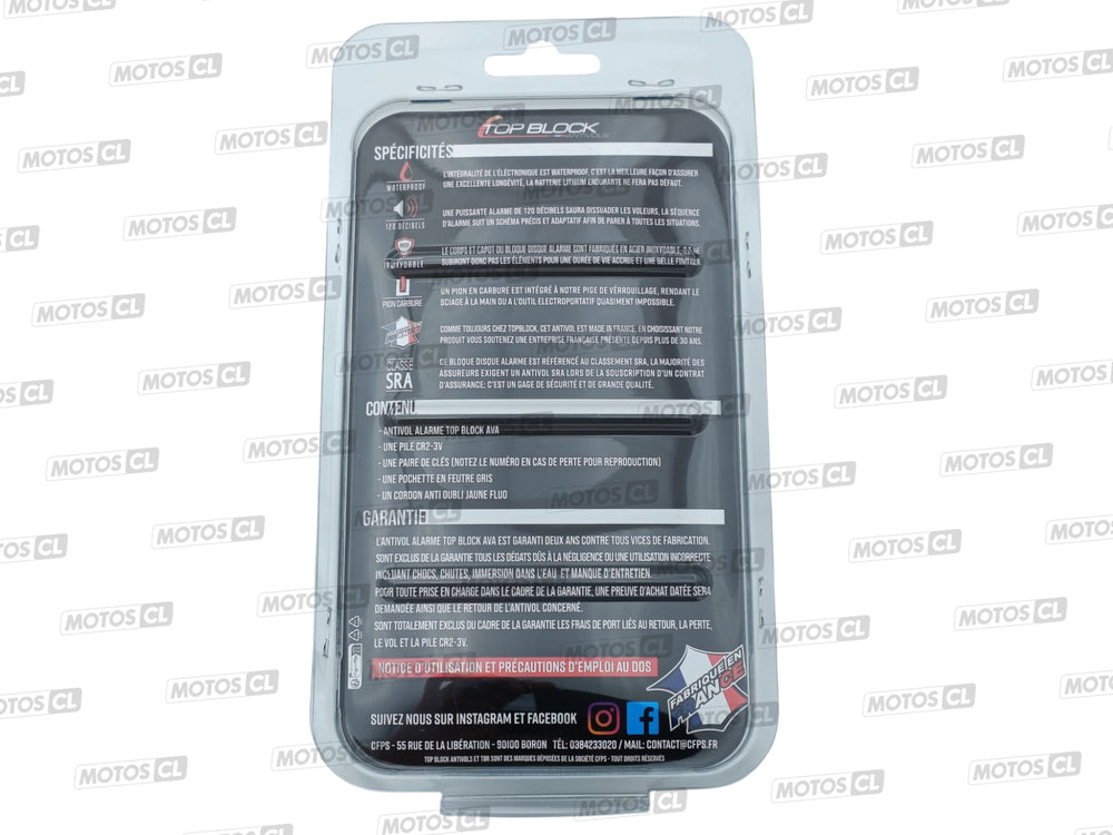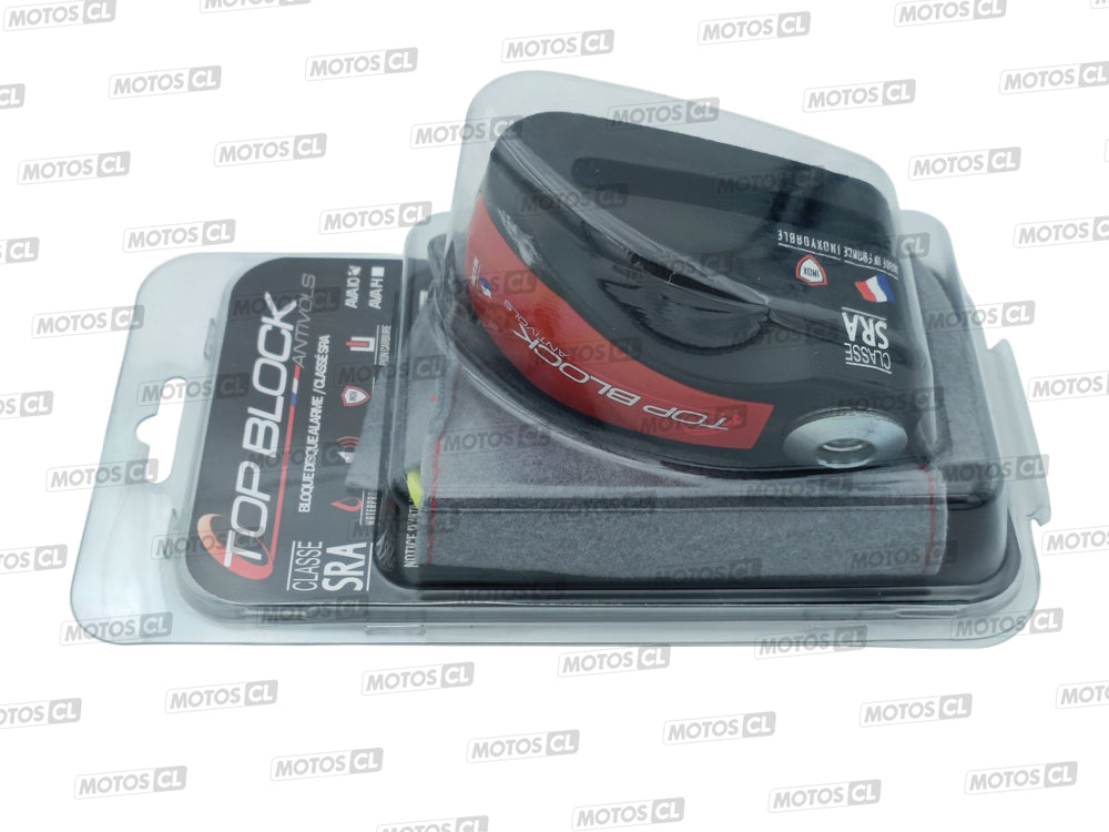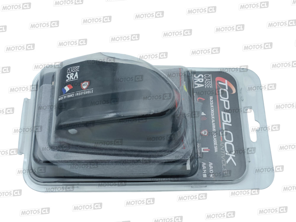 Protection contre le vol, antivol bloque disque alarme universel modèle AVA10 certifié classe SRA, axe Ø10mm* pour une résistance au sciage sans défauts, marque Top Block Fabriqué en France. Exemple : monte sur Honda Forza 125, Yamaha N-Max 125.