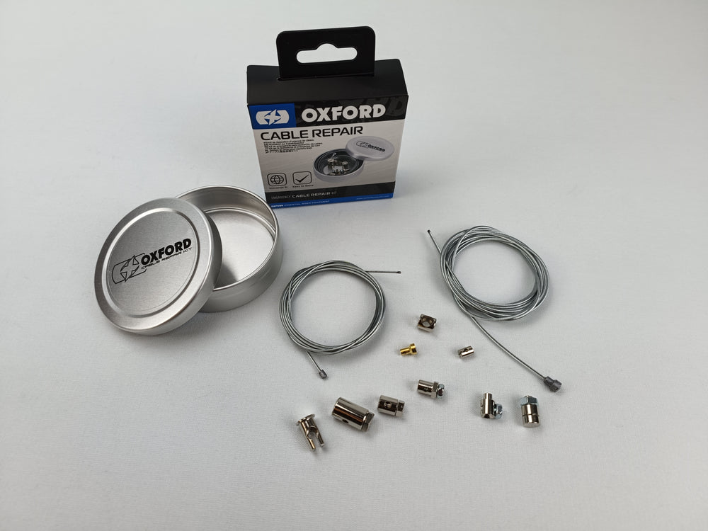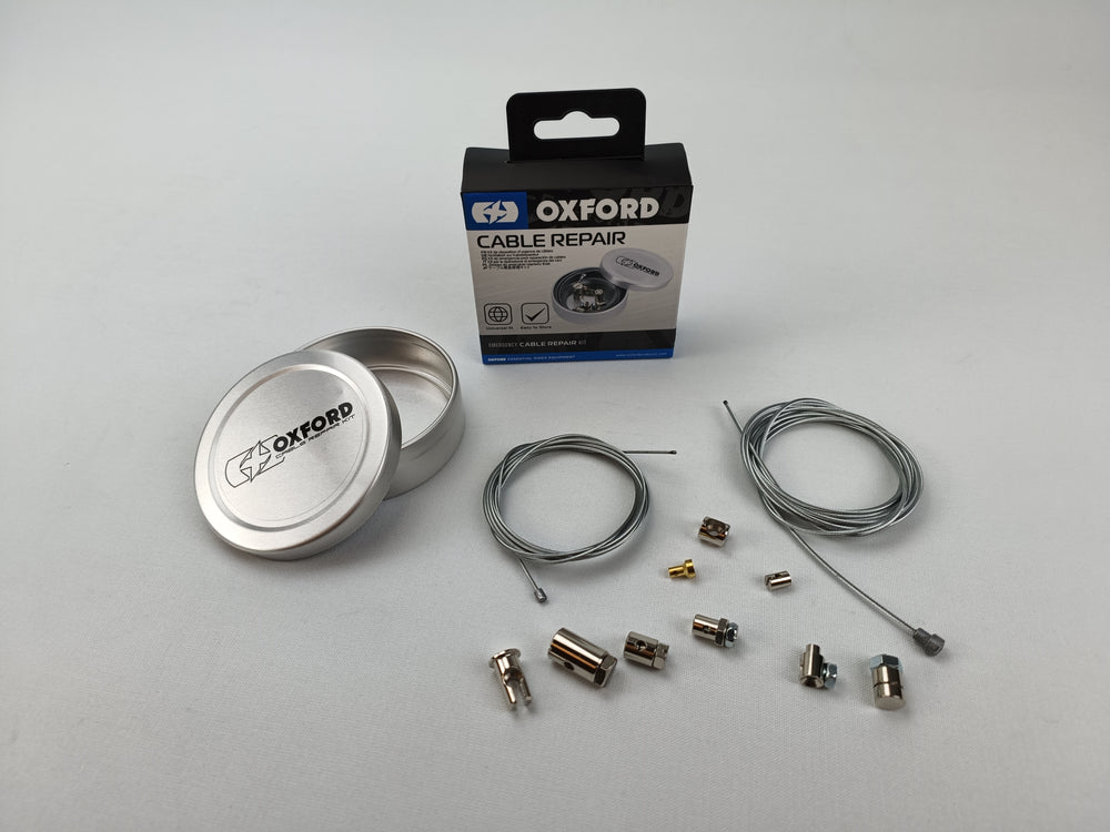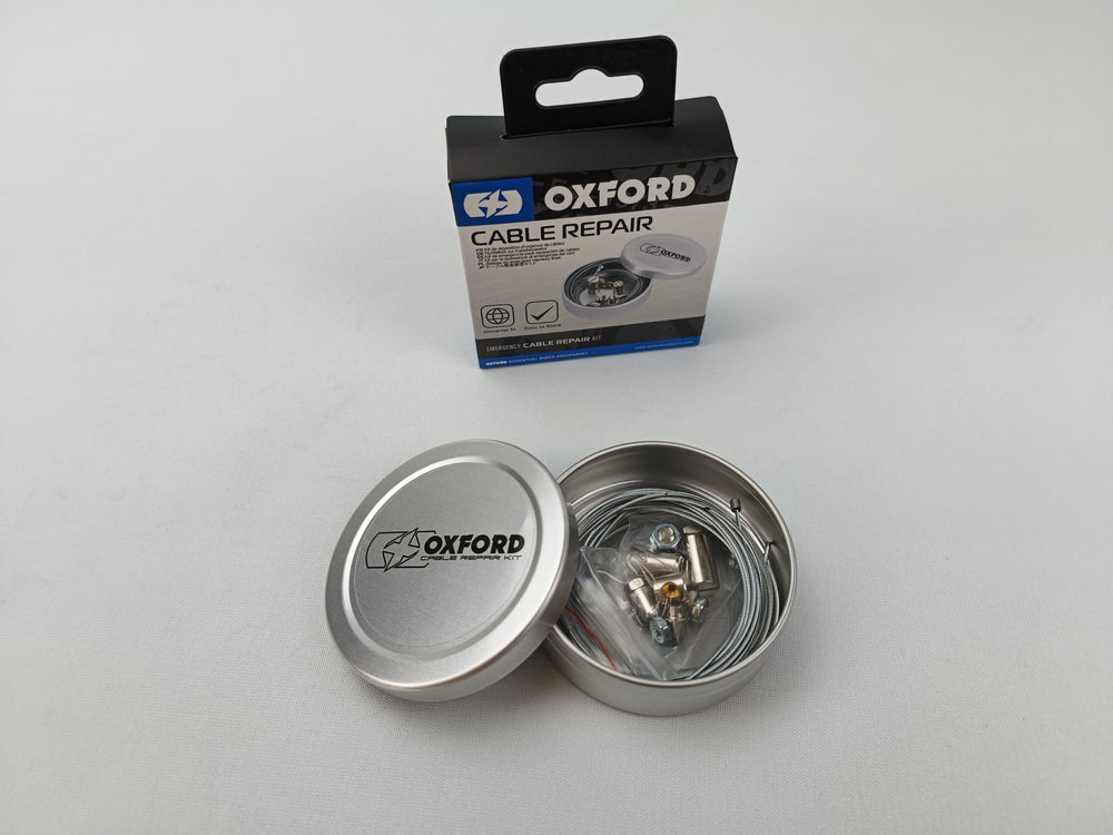 Kit réparation universel pour câbles, marque Oxford. Livré avec 2 x câbles longueur 2 mètres Ø1,1mm et 1,5mm