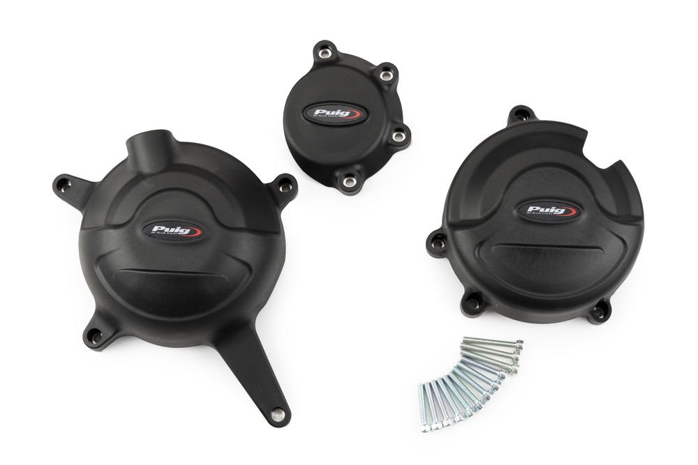 Kit de protection couvre carters moteur (droit et gauche) 3 pièces à visser, pour Honda CBR500R, CB 500 HORNET, CB500F, CB500X, NX500, CB400F, CB400X, CB400RR, marque Puig. Reprend la forme et les points de fixation du carter d'origine.