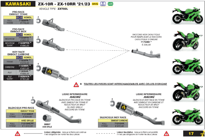 * Peut également monter sur le tube raccord racing Arrow non catalysé ce qui permet de remplacer le raccord catalytique d’origine, dans ce cas l’ensemble n’est plus homologué.