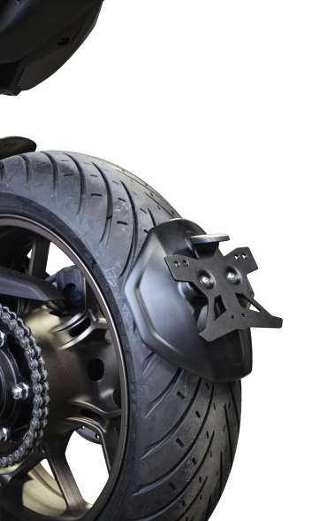 - Montage déporté sur l'arrière du pneu en remplacement de la bavette d'origine